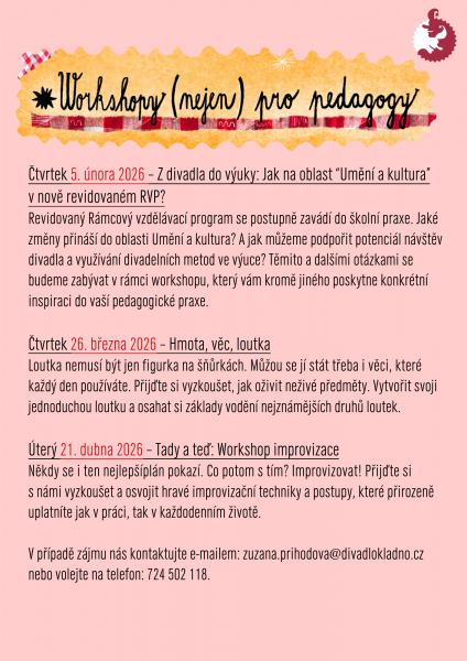 PS: Témata letošních workshopů jsou již daná. Máte-li však vlastní návrh na umělecko-pedagogické zaměření workshopu, které by vás zajímalo, neváhejte napsat naší divadelní lektorce MgA. Tereze Hardtové (terezahardt@gmail.com). Rádi vaše podněty, zájmy a potřeby zohledníme v plánování témat pro příští divadelní sezónu.