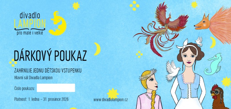 Dárkové poukazy snadno zakoupíte osobně na pokladně Divadla Lampion, pokladně Městského divadla Kladno nebo online. Při objednání online a uhrazení faktury dostanete poukaz na e-mail, takže ho můžete darovat hned!
